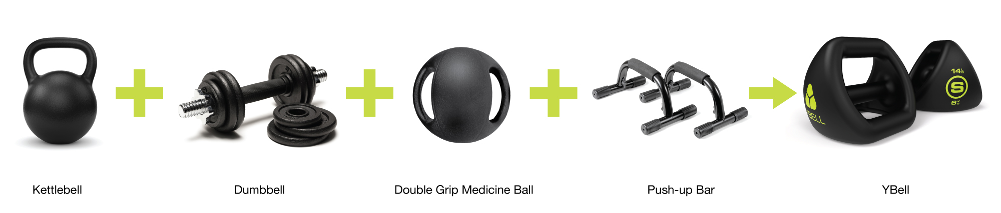 En position centrale, il s’agit d’une haltère. La prise extérieure permet à YBell de servir de kettlebell. La prise inférieure correspond à une double prise de medecine ball, tandis que la prise supérieure remplace le support typique de push-up.