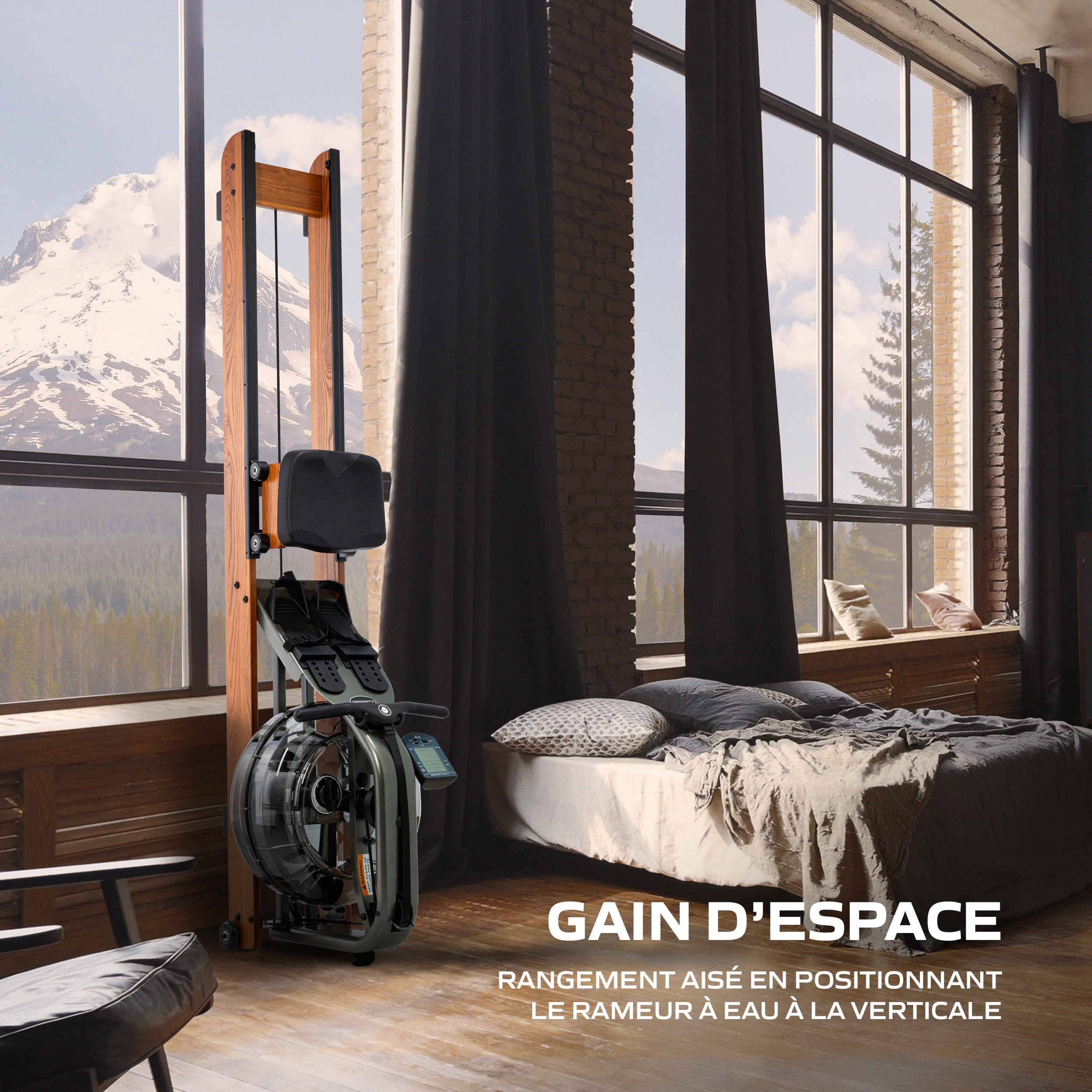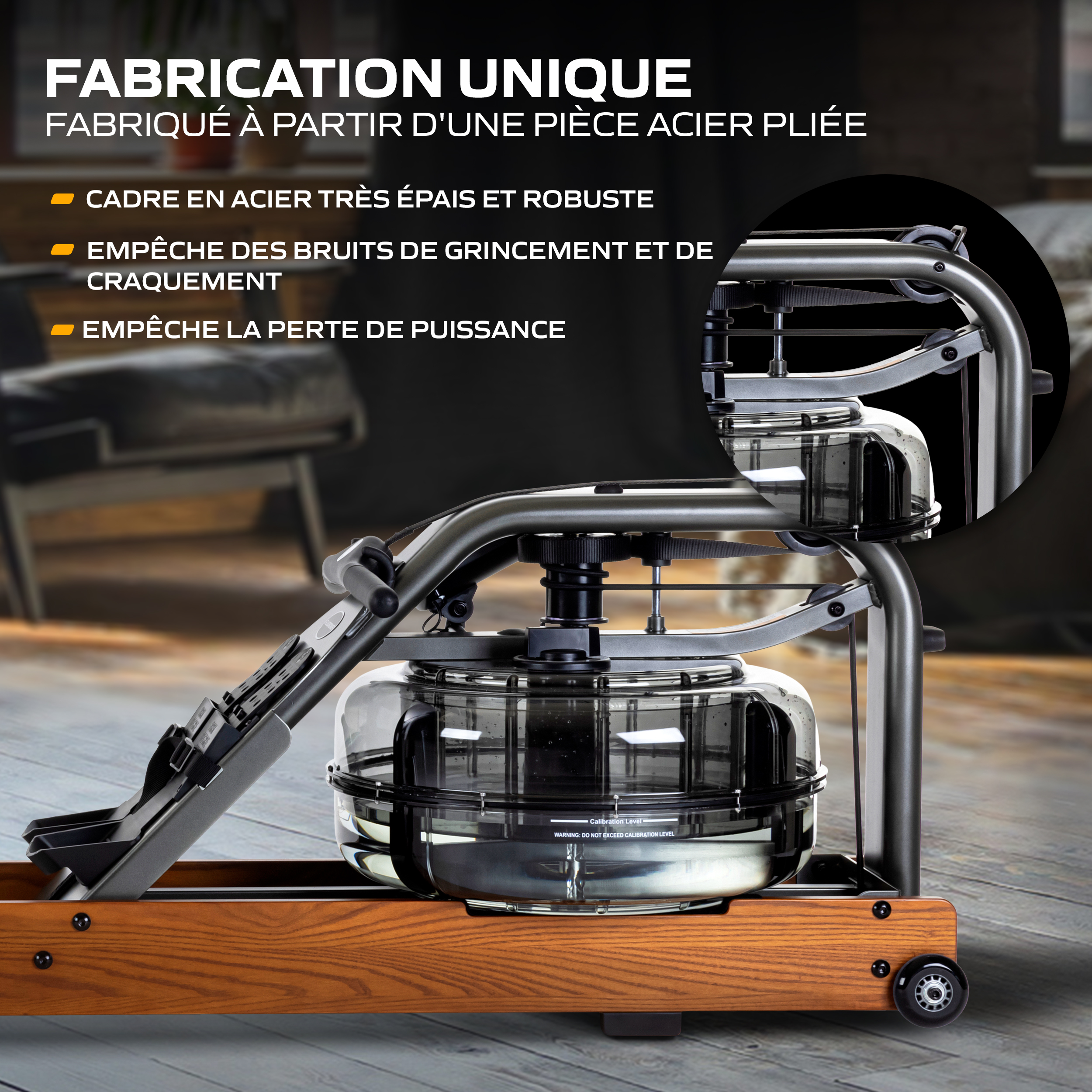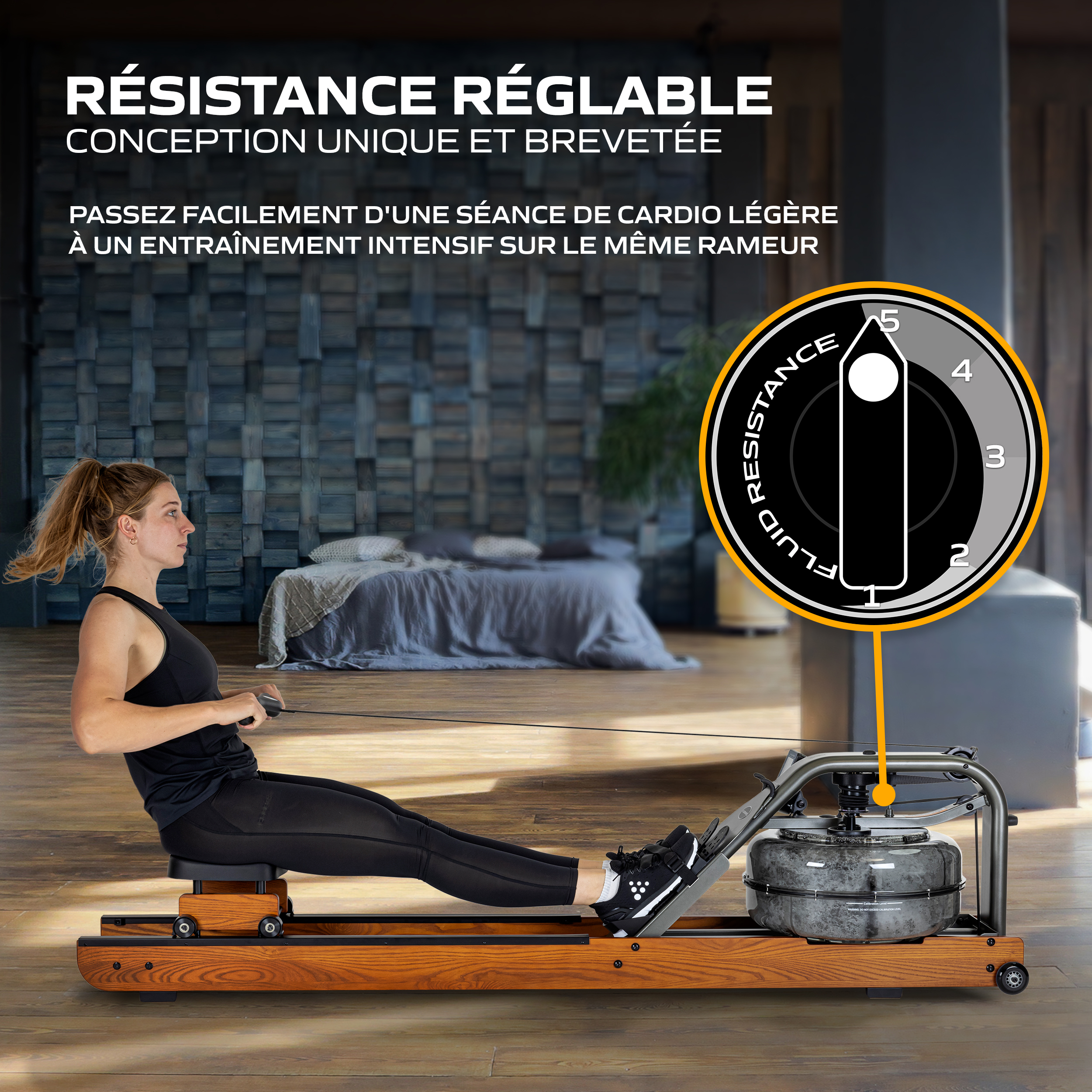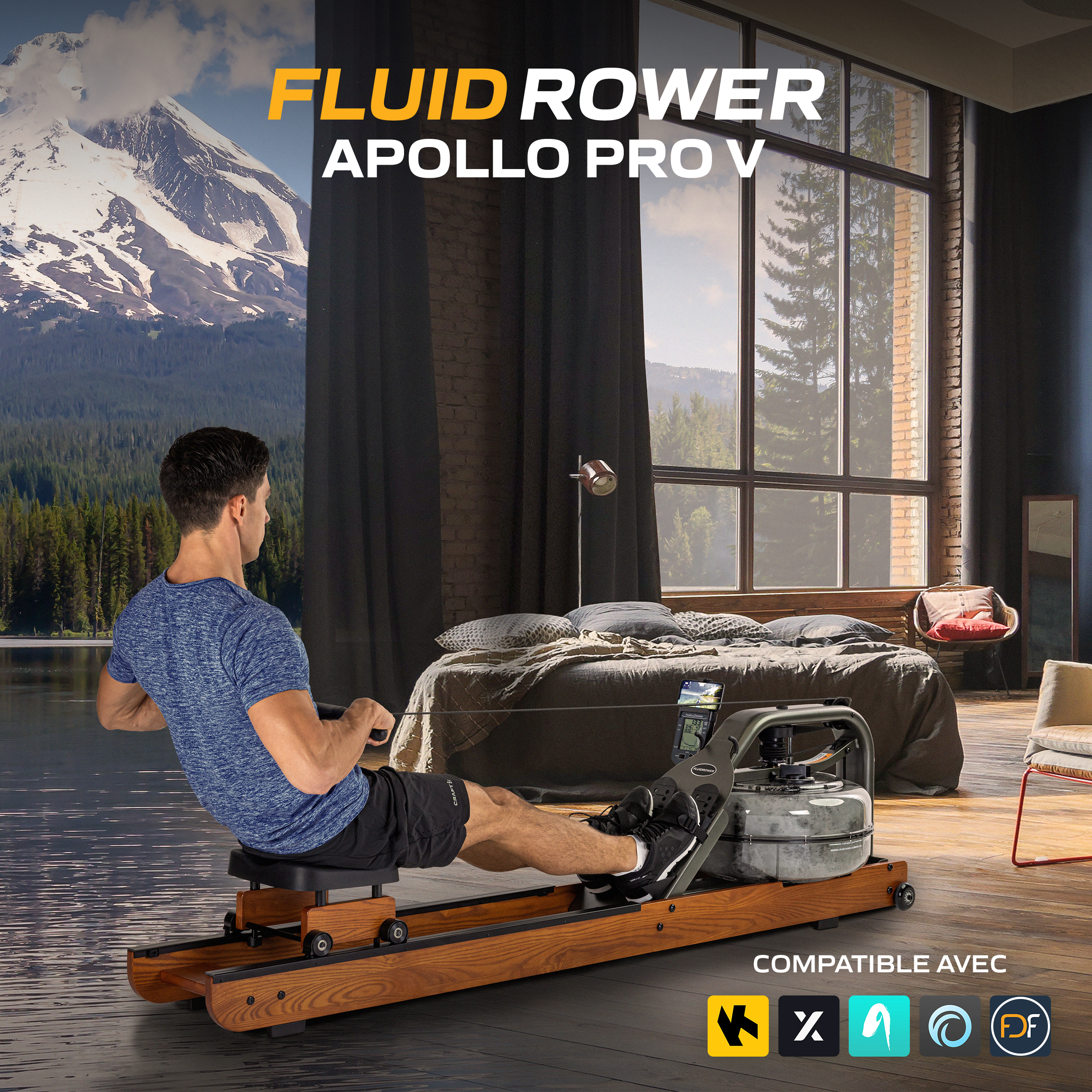 L’Apollo Pro V de Fluid Rower est un rameur de qualité premium à résistance réglable avec lequel vous aurez la sensation de ramer sur l’eau. Il a pour force motrice un V Twin Tank, qui offre 15% de résistance en plus qu’un Twin Tank ordinaire. Avec l’Apollo Pro V, vous disposez d’un rameur professionnel fabriqué en bois et en acier durables, dans une finition luxueuse en chêne foncé.